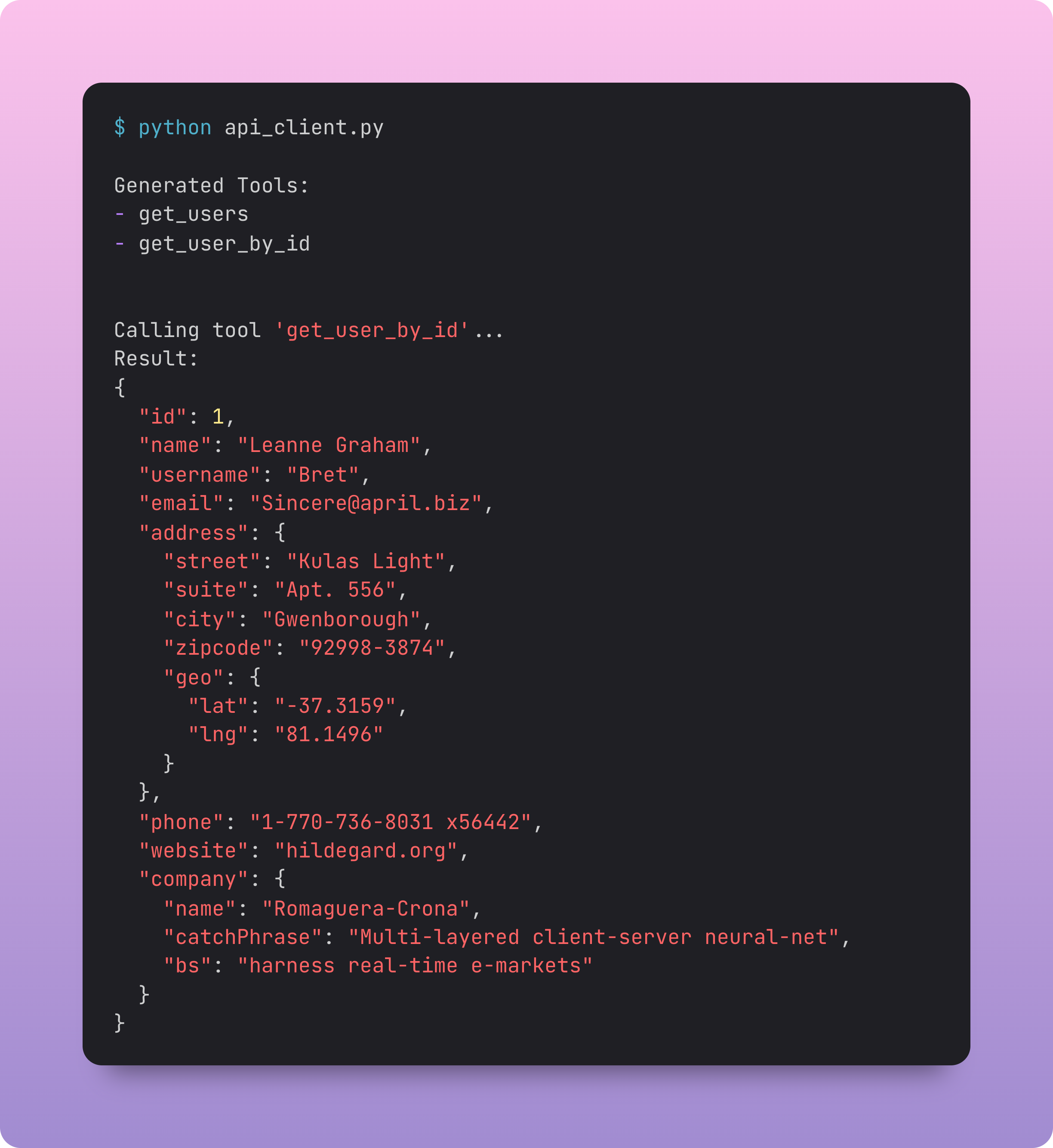 You should see a list of generated tools (get_users, get_user_by_id) and the result of calling the get_user_by_id tool, which fetches data from the live JSONPlaceholder API.